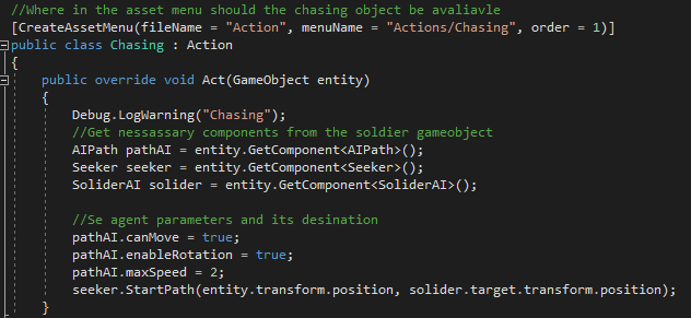 Though these are not actual GameObjects that can be placed or seen in a level they are objects containing data that you can drag and drop into custom components. SOs can be used to contain data for items, weapons and so on, but for me the SOs contain the necessary data and instruction for each action that the AIs will use. This makes it designer friendly because one can be created without having to create a new script and can then be dragged and dropped into the AI component. An example of the SOs action is shown in fig 3.