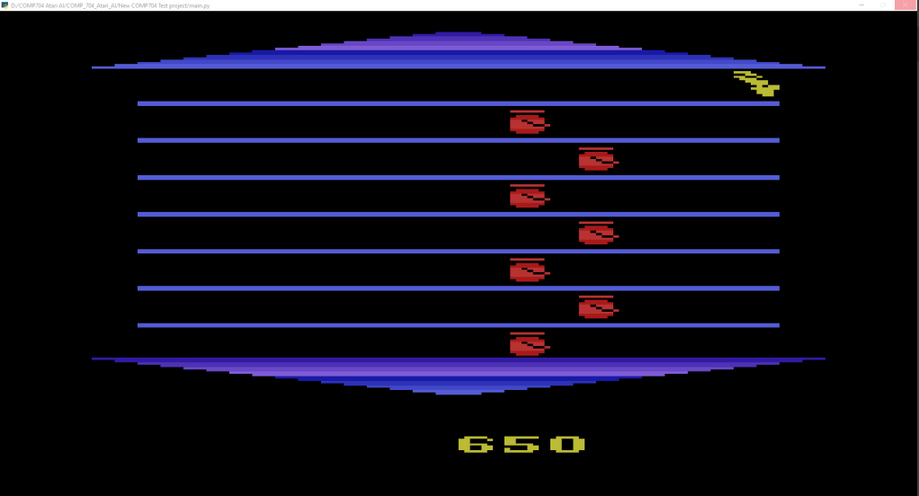 I began training my AI using the GA optimization and it has successfully be able to train the AI to play Asterix(1983). Though the training did take some time especially with new generations being created, in about 2 minutes it was able to reach the highest score in the game (650 points). A screenshot is shown below in fig 6.