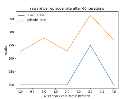 Figure 2: Max Oates. 2022. graph of rewards and episodes over 4 feedback calls.