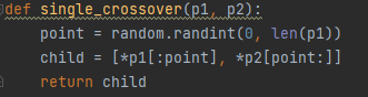 The crossover function was returning individuals that were either empty or combined the wrong way e.g. [learn rate, episode rate] []. In order for it to work, the episode rate needed to be the first element in the array and the learn rate the second one. by using * operator both arrays could be combines properly without any problems. In addition the : operator was used in the lists to get every element up until a random point in both populations. This was done to ensure variations could be applied to the individuals that where being added to the next population, this made the scope of the problem quite small as an effective solution was found relatively soon. An example of the code could be shown below in fig 8.