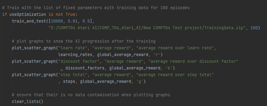 Based on collected training data I will fix the parameters to the set values to ensure that their performance is consistent. While training the AI, I intend it to still use its step checker and feature extraction algorithms so that it will only save its best performances. I will then be training the AI for 100 episodes to see if this will improve its performance. Below in fig 7 is the fixed parameters being used for the AI.