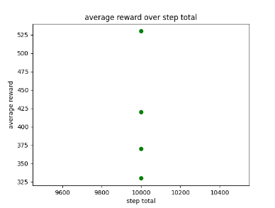 From looking at the results I am quite happy to see it improving, although it can be annoying that the AI can still occasionally make basic mistakes when in the environment and will still use the design flaw. Taking this further, the AI is still making mistakes, causing it to get lower scores than previous iterations, by this I mean the previous AI’s lowest score was 400 while now it can get 200. That being said, looking at the agent’s movement, the AI can recognise patterns in the environment’s randomness, allowing it to avoid obstacles and get rewards, thus allowing it to get a score as high as 750. Taking the training further and possibly changing the parameters slightly could allow for better performance. That being said, for the time being, having the AI’s parameters fixed at 10,000 for the step total, 0.5 as the learning rate and 0.752 as the discount factor will do very well for the time being. Although the reward may not remain 750 consistently at the start, it is able to score 750 throughout the entire game at an inconsistent rate, rather than eventually dropping over time.