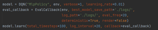 As you can see from fig 1, the model has parameters that I can use to adjust the number of steps it performs during its training process and how often it will log its progress. In addition, by using the event_callback parameter I can allow it to save and store data that I can then display later on a graph.