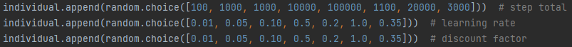 Based on collected training data I will fix the parameters to the set values to ensure that their performance is consistent. While training the AI, I intend it to still use its step checker and feature extraction algorithms so that it will only save its best performances. I will then be training the AI for 100 episodes to see if this will improve its performance. Below in fig 7 is the fixed parameters being used for the AI.