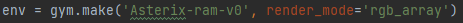 After trying the DQN AI on the university computer I was surprised to experience the same problem, however after some experimentation I replaced the current environment version of Asterix with it’s RAM counterpart which made it work. It works by instead of it monitoring every pixel in the environment, it instead extracts the data from the computer’s RAM memory to make decisions on what to do (Anonymous 2016). This allowed me to run the Atari environment while still using DQN as the agent’s AI. A screenshot of the code that I used for the RAM environment is show below in fig 3.